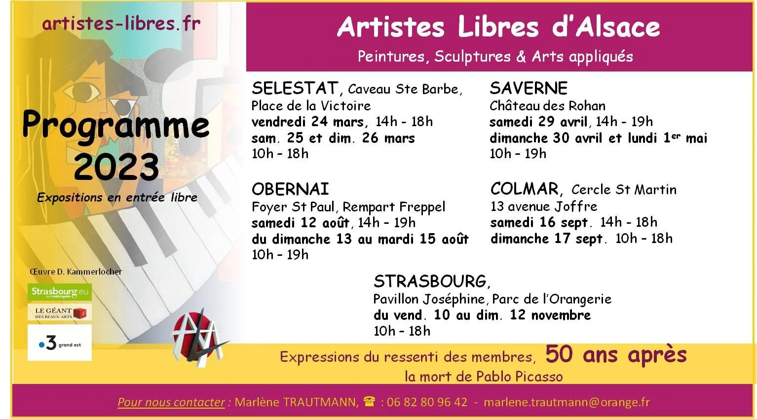 En tant que membre des Artistes Libres d’Alsace, je participerai à certaines des expositions présentées ci-dessus :